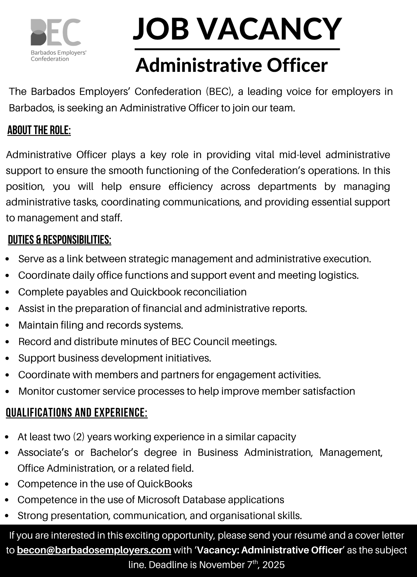The BEC advertises vacancies for their clients from time to time. Please scroll to view and apply for any of the jobs available or share with a friend who may be seeking employment.